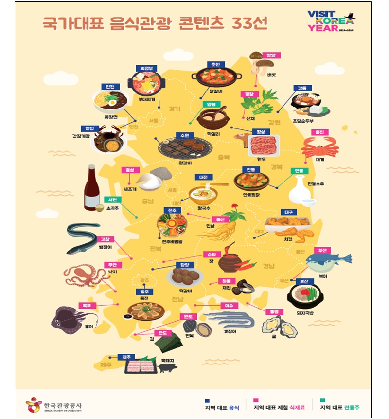 문화체육관광부와 한국관광공사는 '테이스트 유어 코리아(Taste your Korea)'라는 새로운 브랜드를 개발하고, 대한민국을 대표하는 33개의 음식관광 콘텐츠를 선정했습니다.
